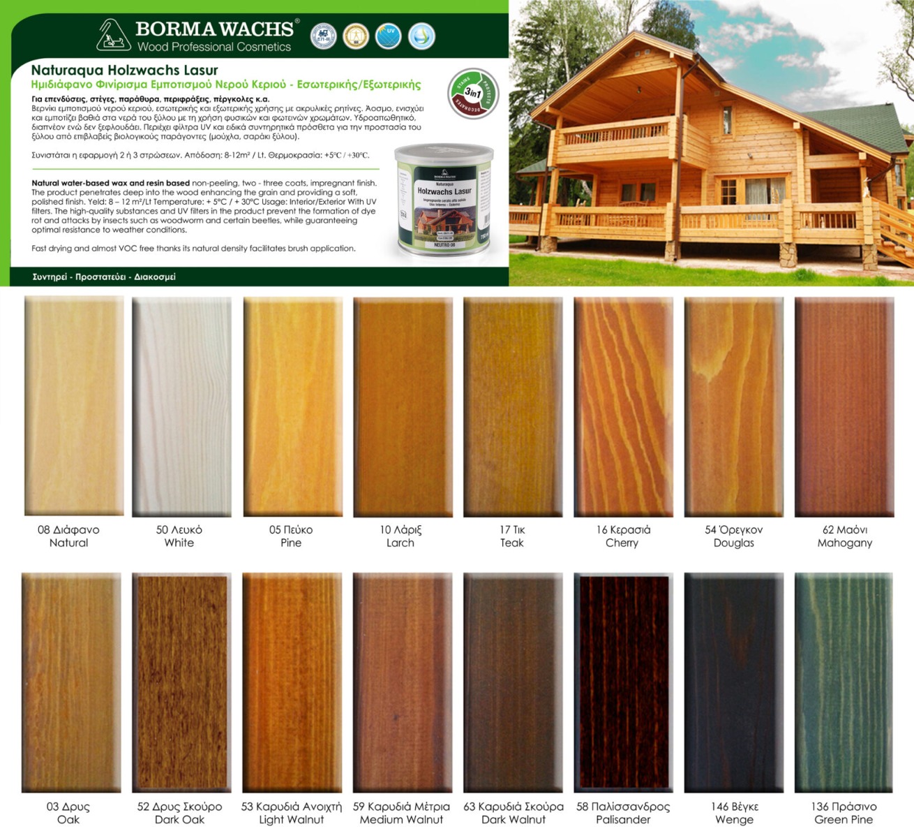 Οι αποχρώσεις του NATURAQUA HOLZWACHS LASUR είναι φωτεινότερες από τις αντίστοιχες του HOLZWACHS LASUR. Το επίπεδο προστασίας που προσφέρουν τα δύο προϊόντα είναι παρόμοιο, ωστόσο στην έκδοση νερού απαιτείται να προηγηθεί τρίψιμο πριν το φρεσκάρισμα.