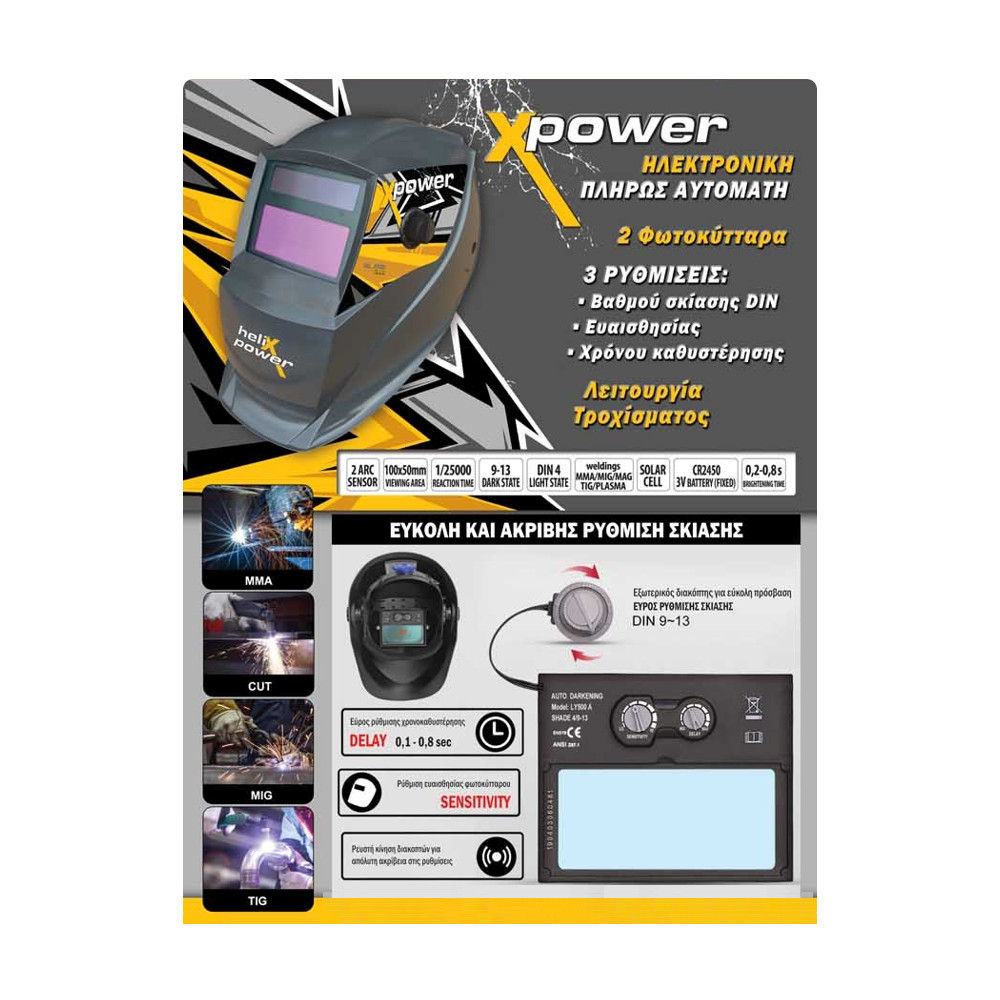 Aυτοσκιαζομενη ηλεκτρονικη μασκα ηλεκτροσυγκολλητη. Με ρυθμιζομενο βαθμο σκιασης, χρονοκαθυστερησης και ευαισθησιας.